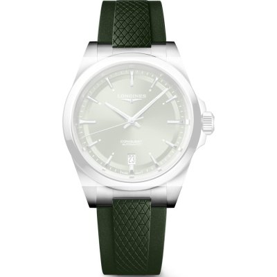 Questo cinturino Longines è fatto in gomma ed è collegato all'orologio per mezzo di perni a molla. Il cinturino ha una larghezza di 19 mm. Il cinturino non ha montatura dritta, il che significa che questo cinturino è adatto solo per gli orologi elencati di seguito.