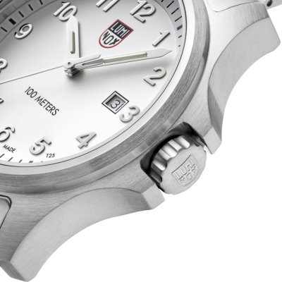 Questo orologio Luminox ha una cassa in Inox con un diametro di 43 mm ed è dotato di un cinturino in Inox. All'interno della cassa si trova un movimento di Ronda e l'orologio è dotato di un cristallo di Zaffiro singolo antiriflesso.