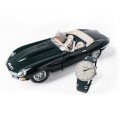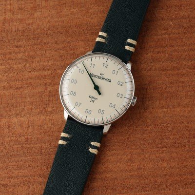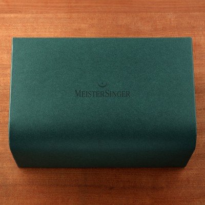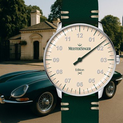 L'orologio Neo J.E Meistersinger, in edizione limitata a 100 esemplari numerati, è la quintessenza della Gran Bretagna, con il suo design ispirato all'iconica auto Jaguar E-Type. Ogni orologio viene fornito in un cofanetto con un modello in scala 1:18 della Jaguar E-Type Cabrio. Con una cassa sottile di 36 mm di diametro e vetro zaffiro bombato, il Neo J.E sembra uscito da un film di James Bond degli anni Sessanta! Inoltre, il quadrante color crema richiama gli interni e il tetto della E-Type. Il British Racing Green della vernice del veicolo si riflette nel cinturino in pelle, nei dettagli del quadrante e nella singola lancetta verde. Le indicazioni dei cinque minuti color cognac ricordano il volante in legno originale della Jaguar E-Type. Infine, le cifre argentate ricordano i cerchioni cromati dell'auto e conferiscono al quadrante una maggiore profondità. L'orologio è alimentato da un movimento automatico Sellita SW200 modificato per Meistersinger con una riserva di carica di 38 ore.