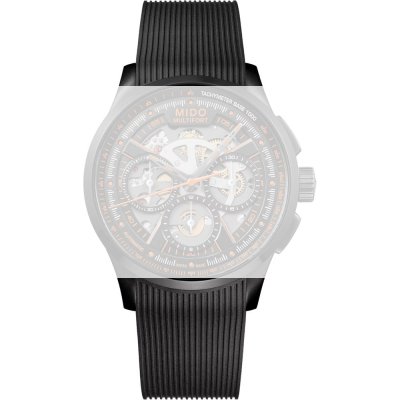 Questo cinturino MIDO è fatto in gomma ed è collegato all'orologio per mezzo di perni a molla a sgancio rapido. Il cinturino ha una larghezza di 22 mm e si chiude a mezzo di fibbia. Il cinturino non ha montatura dritta, il che significa che questo cinturino è adatto solo per gli orologi elencati di seguito.