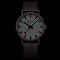 Questo orologio Mondaine ha una cassa in Inox con un diametro di 40 mm ed è dotato di un cinturino in Inox. All'interno della cassa si trova un movimento di Ronda e l'orologio è dotato di un cristallo di Minerale indurito.