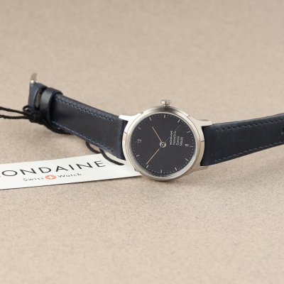 Questo orologio Mondaine ha una cassa in Inox con un diametro di 26 mm ed è dotato di un cinturino in Pelle. All'interno della cassa si trova un movimento di Ronda e l'orologio è dotato di un cristallo di Zaffiro.