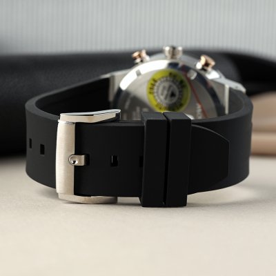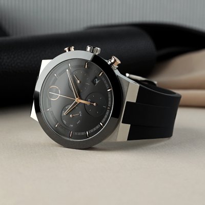 Questo orologio Movado ha una cassa in Inox con un diametro di 44 mm ed è dotato di un cinturino in gomma. All'interno della cassa si trova un movimento di Ronda e l'orologio è dotato di un cristallo di K1 Minerale.