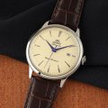 Questo orologio Orient ha una cassa in Inox con un diametro di 40 mm ed è dotato di un cinturino in Pelle. All'interno della cassa si trova un movimento di Orient e l'orologio è dotato di un cristallo di Minerale.