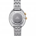 Questo orologio Orient ha una cassa in Inox con un diametro di 43.5 mm ed è dotato di un cinturino in Metallo. All'interno della cassa si trova un movimento di Orient e l'orologio è dotato di un cristallo di Minerale.