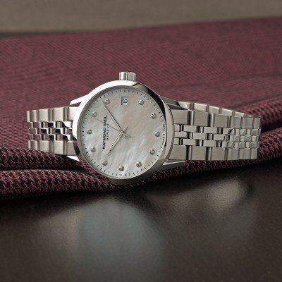 Questo orologio Raymond Weil ha una cassa in Inox con un diametro di 34 mm ed è dotato di un cinturino in Inox. All'interno della cassa si trova un movimento di ETA e l'orologio è dotato di un cristallo di Zaffiro.