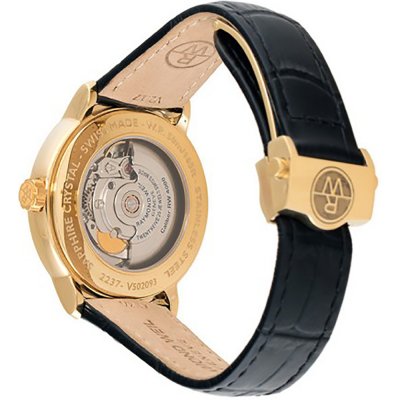 Le finiture di questo orologio Raymond Weil Maestro sono eccellenti. Dalla cassa splendidamente tagliata in oro alle eleganti lancette blu che contrastano con il brillante quadrante guilloché a onde Moiré. Il semplice datario a ore tre e il cinturino in pelle nera con fibbia deployante dorata completano il look elegante e lussuoso.