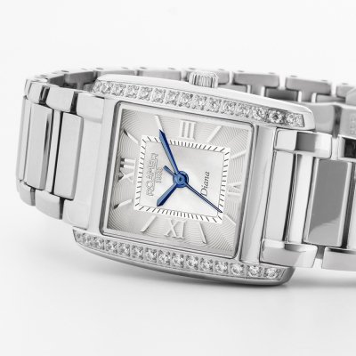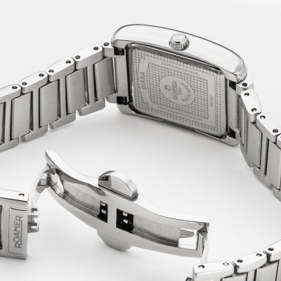 Questo orologio Roamer ha una cassa in Inox con un diametro di 22 mm ed è dotato di un cinturino in Inox. All'interno della cassa si trova un movimento di Ronda e l'orologio è dotato di un cristallo di Zaffiro.