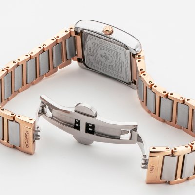 Questo orologio Roamer ha una cassa in Inox con un diametro di 22 mm ed è dotato di un cinturino in Inox. All'interno della cassa si trova un movimento di Ronda e l'orologio è dotato di un cristallo di Zaffiro.