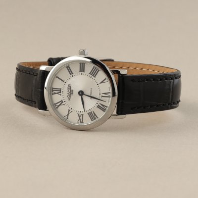Questo orologio Roamer ha una cassa in Inox con un diametro di 28 mm ed è dotato di un cinturino in Pelle. All'interno della cassa si trova un movimento di Ronda e l'orologio è dotato di un cristallo di Zaffiro.