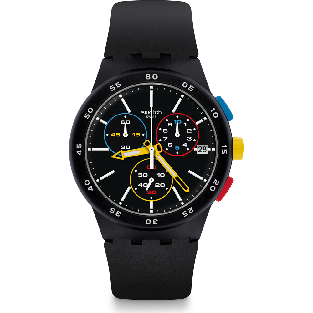 Questo orologio Swatch ha una cassa in plastica con un diametro di 42 mm ed è dotato di un cinturino in Plastica / resina. All'interno ha un movimento Cronografo al quarzo per orologi di qualità ed è finito con un vetro di tipo plexiglass.