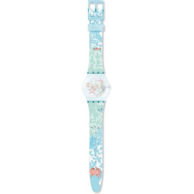 Questo cinturino Swatch è fatto in silicone ed è collegato all'orologio per mezzo di perni in acciaio. Il cinturino ha una larghezza di 17 mm e si chiude a mezzo di fibbia. Il cinturino non ha montatura dritta, il che significa che questo cinturino è adatto solo per gli orologi elencati di seguito.