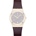 Questo cinturino Swatch è fatto in pelle ed è collegato all'orologio per mezzo di perni in acciaio. Il cinturino ha una larghezza di 17 mm e si chiude a mezzo di fibbia. Il cinturino non ha montatura dritta, il che significa che questo cinturino è adatto solo per gli orologi elencati di seguito.