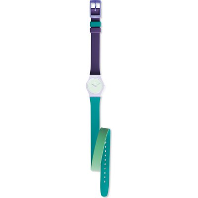 Questo cinturino Swatch è fatto in silicone ed è collegato all'orologio per mezzo di perni in acciaio. Il cinturino ha una larghezza di 12 mm e si chiude a mezzo di fibbia. Il cinturino non ha montatura dritta, il che significa che questo cinturino è adatto solo per gli orologi elencati di seguito.