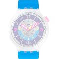 Questo cinturino Swatch è fatto in silicone ed è collegato all'orologio per mezzo di perni in acciaio. Il cinturino ha una larghezza di 19.7 mm e si chiude a mezzo di fibbia. Il cinturino non ha montatura dritta, il che significa che questo cinturino è adatto solo per gli orologi elencati di seguito.