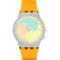 Questo cinturino Swatch è fatto in silicone ed è collegato all'orologio per mezzo di perni in acciaio. Il cinturino ha una larghezza di 20.1 mm e si chiude a mezzo di fibbia. Il cinturino non ha montatura dritta, il che significa che questo cinturino è adatto solo per gli orologi elencati di seguito.