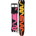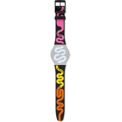 Questo cinturino Swatch è fatto in silicone ed è collegato all'orologio per mezzo di perni in acciaio. Il cinturino ha una larghezza di 19.7 mm e si chiude a mezzo di fibbia. Il cinturino non ha montatura dritta, il che significa che questo cinturino è adatto solo per gli orologi elencati di seguito.