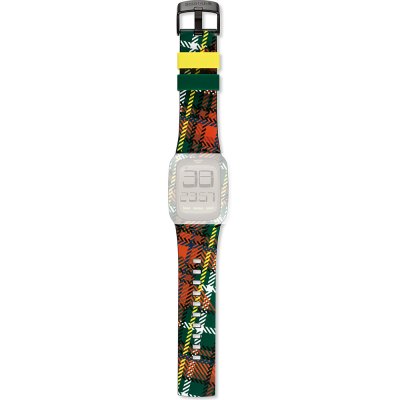 Questo cinturino Swatch è fatto in silicone ed è collegato all'orologio per mezzo di perni in acciaio. Il cinturino ha una larghezza di 28 mm e si chiude a mezzo di fibbia. Il cinturino non ha montatura dritta, il che significa che questo cinturino è adatto solo per gli orologi elencati di seguito.