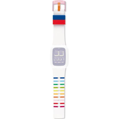 Questo cinturino Swatch è fatto in silicone ed è collegato all'orologio per mezzo di perni in acciaio. Il cinturino ha una larghezza di 28 mm e si chiude a mezzo di fibbia. Il cinturino non ha montatura dritta, il che significa che questo cinturino è adatto solo per gli orologi elencati di seguito.