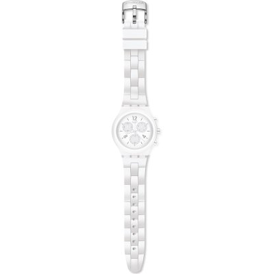 Questo cinturino Swatch è fatto in silicone ed è collegato all'orologio per mezzo di perni in acciaio. Il cinturino ha una larghezza di 19.9 mm e si chiude a mezzo di fibbia. Il cinturino non ha montatura dritta, il che significa che questo cinturino è adatto solo per gli orologi elencati di seguito.