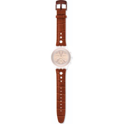 Questo cinturino Swatch è fatto in pelle ed è collegato all'orologio per mezzo di perni in acciaio. Il cinturino ha una larghezza di 19.9 mm e si chiude a mezzo di fibbia. Il cinturino non ha montatura dritta, il che significa che questo cinturino è adatto solo per gli orologi elencati di seguito.