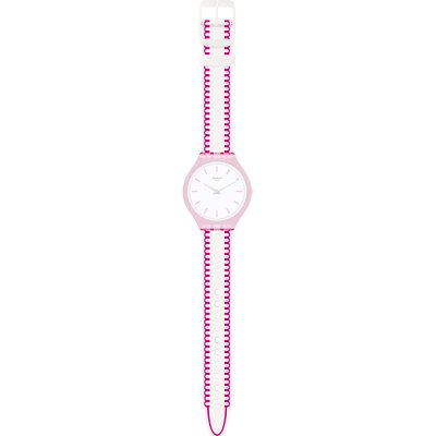Questo cinturino Swatch è fatto in silicone ed è collegato all'orologio per mezzo di perni in acciaio. Il cinturino ha una larghezza di 14.6 mm e si chiude a mezzo di fibbia. Il cinturino non ha montatura dritta, il che significa che questo cinturino è adatto solo per gli orologi elencati di seguito.