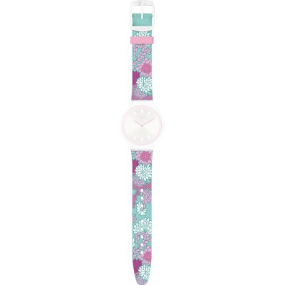 Questo cinturino Swatch è fatto in silicone ed è collegato all'orologio per mezzo di perni in acciaio. Il cinturino ha una larghezza di 14.6 mm e si chiude a mezzo di fibbia. Il cinturino non ha montatura dritta, il che significa che questo cinturino è adatto solo per gli orologi elencati di seguito.