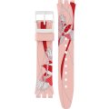 Questo cinturino Swatch è fatto in silicone ed è collegato all'orologio per mezzo di perni in acciaio. Il cinturino ha una larghezza di 17 mm e si chiude a mezzo di fibbia. Il cinturino non ha montatura dritta, il che significa che questo cinturino è adatto solo per gli orologi elencati di seguito.
