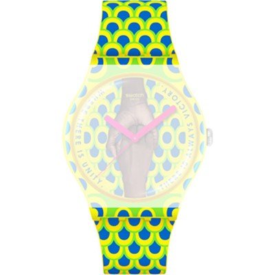 Questo cinturino Swatch è fatto in silicone ed è collegato all'orologio per mezzo di perni in acciaio. Il cinturino ha una larghezza di 19.7 mm e si chiude a mezzo di fibbia. Il cinturino non ha montatura dritta, il che significa che questo cinturino è adatto solo per gli orologi elencati di seguito.