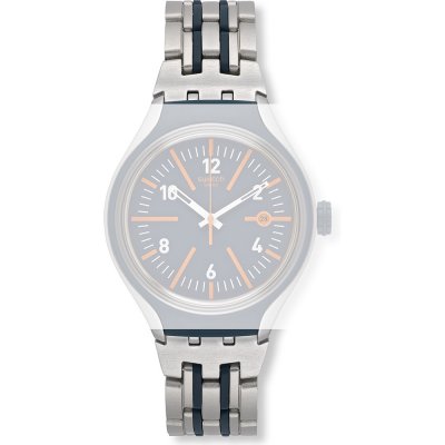 Questo cinturino Swatch è fatto in alluminio ed è collegato all'orologio per mezzo di perni in acciaio. Il cinturino ha una larghezza di 18.1 mm e si chiude a mezzo di chiusura deployante con bottoni e sicurezza. Il cinturino non ha montatura dritta, il che significa che questo cinturino è adatto solo per gli orologi elencati di seguito.