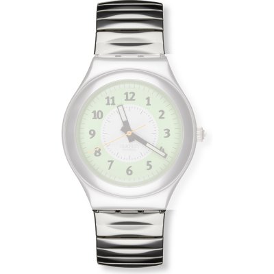 Questo cinturino Swatch è fatto in acciaio inox ed è collegato all'orologio per mezzo di perni in acciaio. Il cinturino ha una larghezza di 17 mm. Il cinturino non ha montatura dritta, il che significa che questo cinturino è adatto solo per gli orologi elencati di seguito.