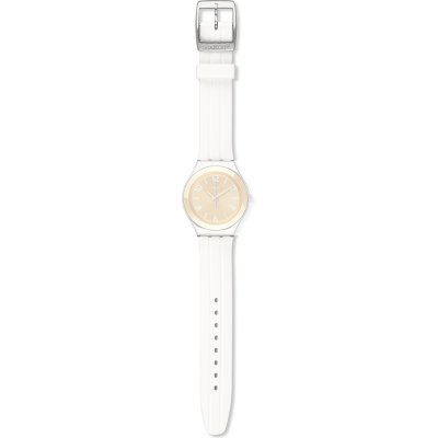 Questo cinturino Swatch è fatto in silicone ed è collegato all'orologio per mezzo di perni in acciaio. Il cinturino ha una larghezza di 17 mm e si chiude a mezzo di fibbia. Il cinturino non ha montatura dritta, il che significa che questo cinturino è adatto solo per gli orologi elencati di seguito.