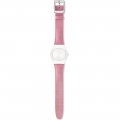 Questo cinturino Swatch è fatto in pelle ed è collegato all'orologio per mezzo di perni in acciaio. Il cinturino ha una larghezza di 17 mm e si chiude a mezzo di fibbia. Il cinturino non ha montatura dritta, il che significa che questo cinturino è adatto solo per gli orologi elencati di seguito.