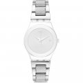 Questo cinturino Swatch è fatto in acciaio inox ed è collegato all'orologio per mezzo di perni in acciaio. Il cinturino ha una larghezza di 17 mm e si chiude a mezzo di chiusura a gioiello. Il cinturino non ha montatura dritta, il che significa che questo cinturino è adatto solo per gli orologi elencati di seguito.