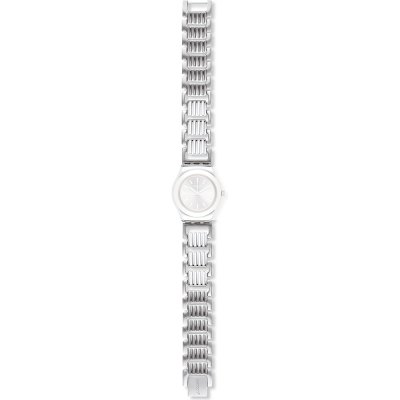 Questo cinturino Swatch è fatto in acciaio inox ed è collegato all'orologio per mezzo di perni in acciaio. Il cinturino ha una larghezza di 12 mm e si chiude a mezzo di chiusura a gioiello. Il cinturino non ha montatura dritta, il che significa che questo cinturino è adatto solo per gli orologi elencati di seguito.