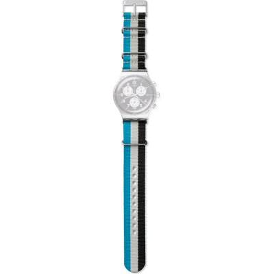 Questo cinturino Swatch è fatto in tessuto ed è collegato all'orologio per mezzo di perni in acciaio. Il cinturino ha una larghezza di 21 mm e si chiude a mezzo di passante. Il cinturino non ha montatura dritta, il che significa che questo cinturino è adatto solo per gli orologi elencati di seguito.