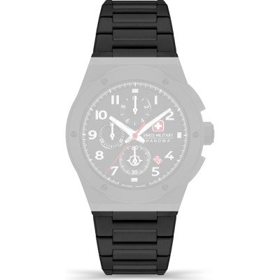 Questo cinturino Swiss Military Hanowa è fatto in acciaio inox ed è collegato all'orologio per mezzo di perni in acciaio. Il cinturino ha una larghezza di 27 mm e si chiude a mezzo di chiusura deployante con bottoni e sicurezza. Il cinturino non ha montatura dritta, il che significa che questo cinturino è adatto solo per gli orologi elencati di seguito.
