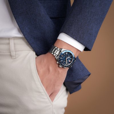 Questo orologio Swiss Military Hanowa ha una cassa in Inox con un diametro di 43 mm ed è dotato di un cinturino in Inox. All'interno della cassa si trova un movimento di Ronda e l'orologio è dotato di un cristallo di Zaffiro.