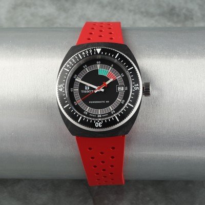 Questo orologio Tissot ha una cassa in Carbonio con un diametro di 41 mm ed è dotato di un cinturino in gomma. All'interno della cassa si trova un movimento di ETA e l'orologio è dotato di un cristallo di Zaffiro singolo antiriflesso.