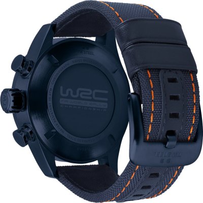 Questo cronografo in edizione speciale è realizzato nei colori blu e arancione del Campionato mondiale di rally e presenta il logo WRC sul fondello.