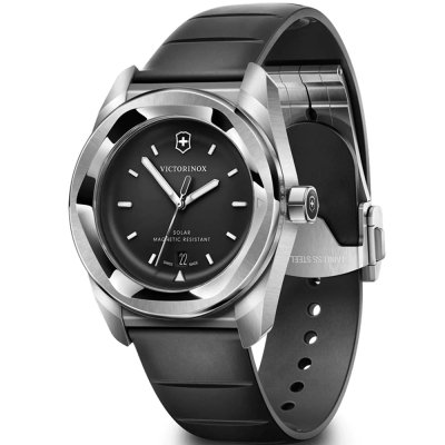 Questo orologio Victorinox ha una cassa in Inox con un diametro di 39 mm ed è dotato di un cinturino in gomma. All'interno della cassa si trova un movimento di Ronda e l'orologio è dotato di un cristallo di Zaffiro singolo antiriflesso.